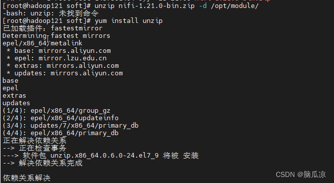如果没有安装这个unzip的命令,那么记得先去安装yum install unzip就可以了